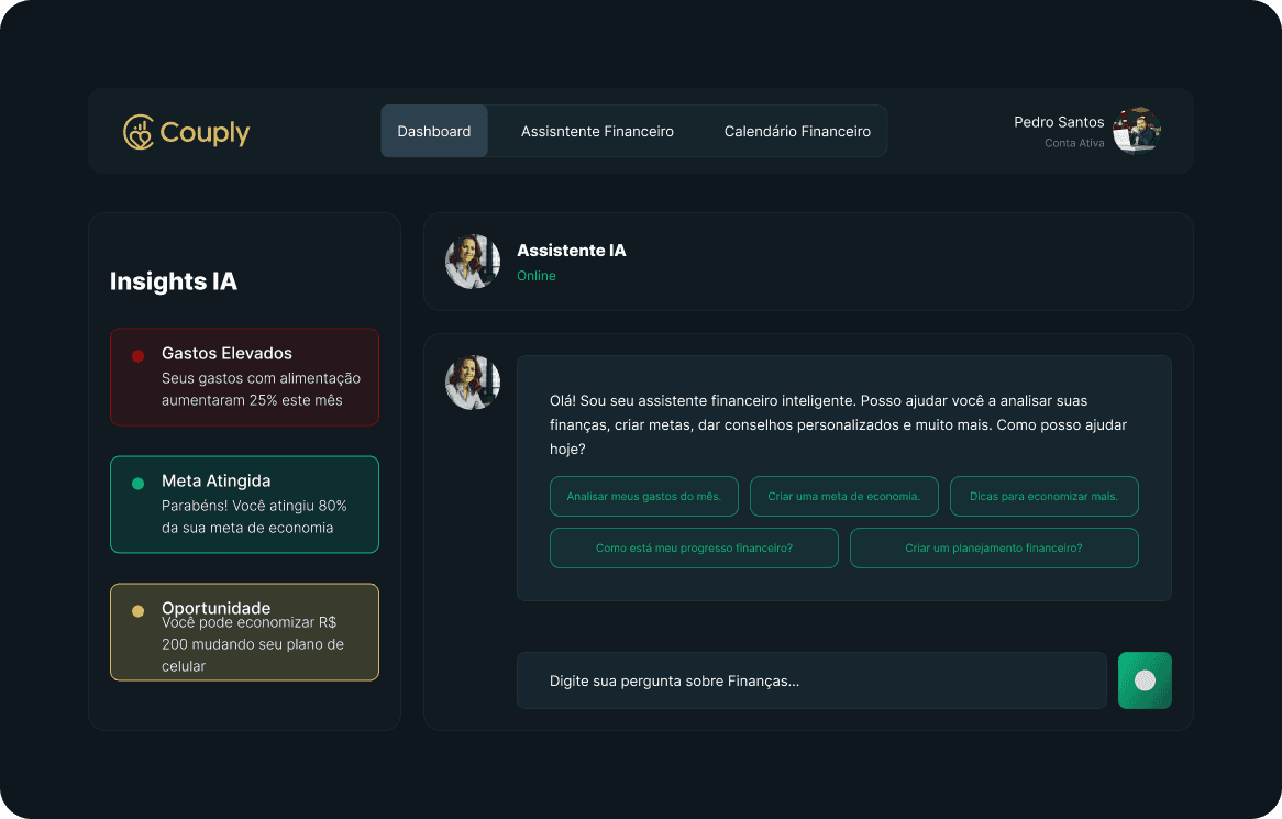Chat com IA disponível 24h para tirar dúvidas, dar dicas personalizadas e orientar suas decisões financeiras.